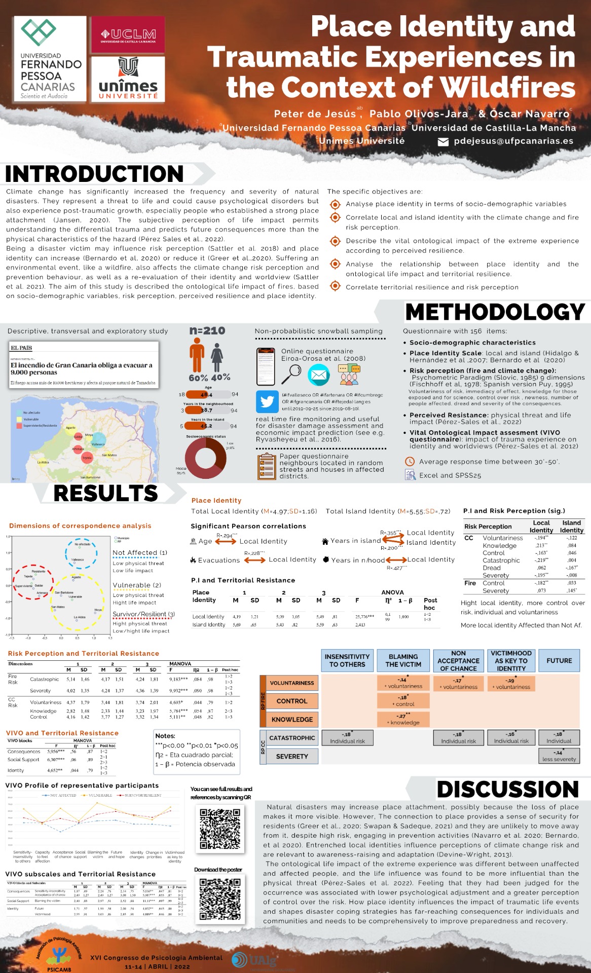El cambio climático ha aumentado significativamente la frecuencia y la gravedad de las catástrofes naturales; lo cual crea una apremiante necesidad de entender los factores que intervienen en el afrontamiento y por qué, pese a una alta percepción de riesgo no llevan a cabo acciones de prevención. Se ha comprobado como la percepción de riesgo esta influida por factores como las características cualitativas del riesgo (por ejemplo, la voluntariedad o el control), características sociodemográficas, la experiencia previa o el conocimiento de riesgos asociados como el cambio climático. Sin embargo, pocos estudios exploran la relación entre sufrir un desastre natural específico, como los incendios, la percepción del cambio climático, y sus impactos en identidad. Aunque a menudo se considera que la experiencia influye en las acciones de mitigación, la investigación sobre catástrofes naturales muestra un efecto inconsistente. Las consecuencias psicológicas tampoco han sido concluyentes, principalmente por la limitación del predominante enfoque centrado en el TEPT, dejando fuera el impacto en la identidad y visión del mundo. Los vínculos con el lugar parecen tener un papel moderador entre el efecto de la experiencia y el afrontamiento. El objetivo general de este estudio consistió en describir el impacto psicológico ocasionado por los incendios, en base a variables sociodemográficas, de percepción de riesgo y de la identidad de lugar. La muestra estuvo compuesta por 210 residentes de zonas afectadas por incendios forestales en Gran Canaria (España) a los cuales se les administró un cuestionario de 156 items divido en 6 secciones que recogían datos de carácter sociodemográfico y evaluaban la identidad de lugar (Hernández et al.,2007), la percepción de riesgo de incendio y cambio climático (Fischhoff et al., 1978 adaptada por Puy, 1995), índice de resistencia percibida (Vergara, 2009), la descripción de la experiencia del incendio y la valoración de la experiencia traumática a través del cuestionario VIVO (Pérez-Sales et al. 2019). A partir del análisis de los datos se proporciona una comprensión de la experiencia de los afectados y el papel mediador de la identidad ambiental.