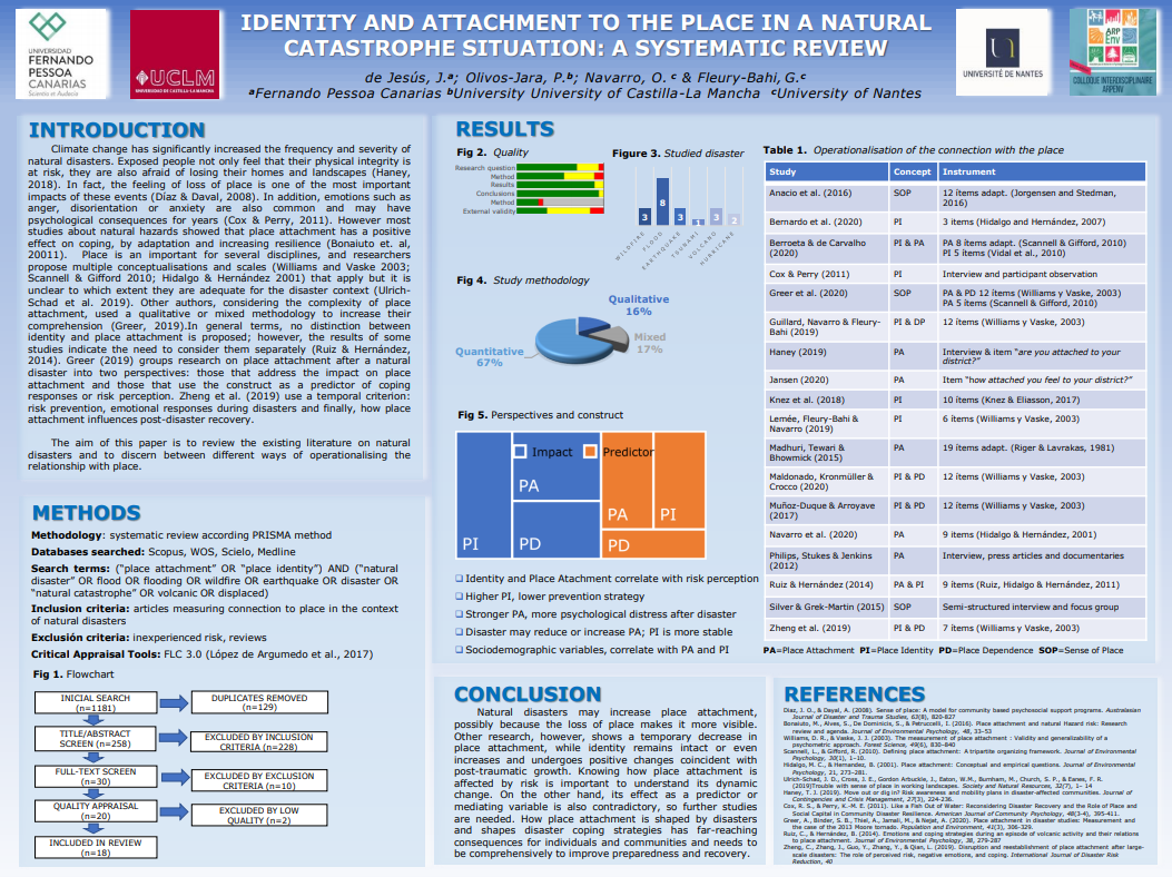"Identity and attachment to the place in a natural catastrophe situation: a systematic review". (7ème Colloque Interdisciplinaire ARPEnv: Défis environnementaux d'aujourd'hui et de demain : mieux comprendre pour mieux accompagner le changement, 2021)